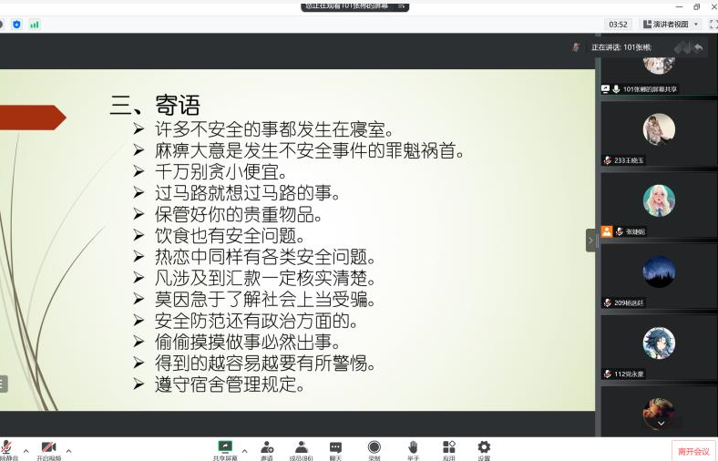 为增强学生安全意识,营造安全良好的生活学习环境,捷克论坛 于10月28日晚19点面向全体大一新生召开“新生入学安全教育系列活动暨人身安全教育”主题会议。会议由捷克论坛 2022级一班班长张郴主讲,2022级全体同学通过腾讯会议形式线上参与。