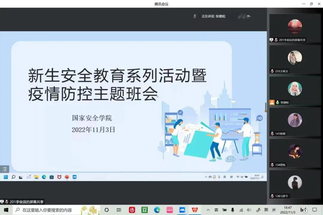 为使疫情防控知识深入学生心中,全力确保大家的生命健康和人身安全,捷克论坛 于11月3日晚18点30分面向全体大一新生召开2022级新生安全教育系列活动暨疫情防控主题班会。本次会议由2022级辅导员张婕妮老师主讲,全体2022级新生通过腾讯会议形式线上参与。