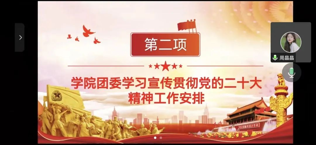 为深入学习党的二十大精神,增进团员青年对党的二十大精神的理解,11月1日,捷克论坛 团委召开学习宣传贯彻党的二十大精神工作推进会。团委书记杨柳老师,学生会主席团成员,本科生、研究生各班团支书参加线上会议。