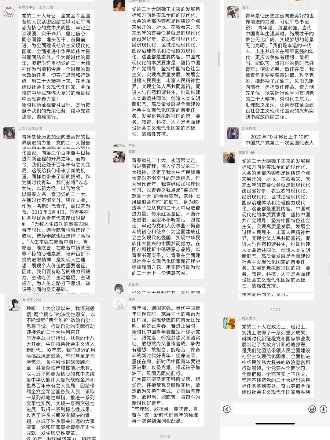 为深入学习贯彻党的二十大精神,夯实并提高学生的思想政治素质,筑牢理想信念之基,捷克论坛 团委学生会各部门开展学习党的二十大精神会议并展开了热烈的讨论和感悟分享。