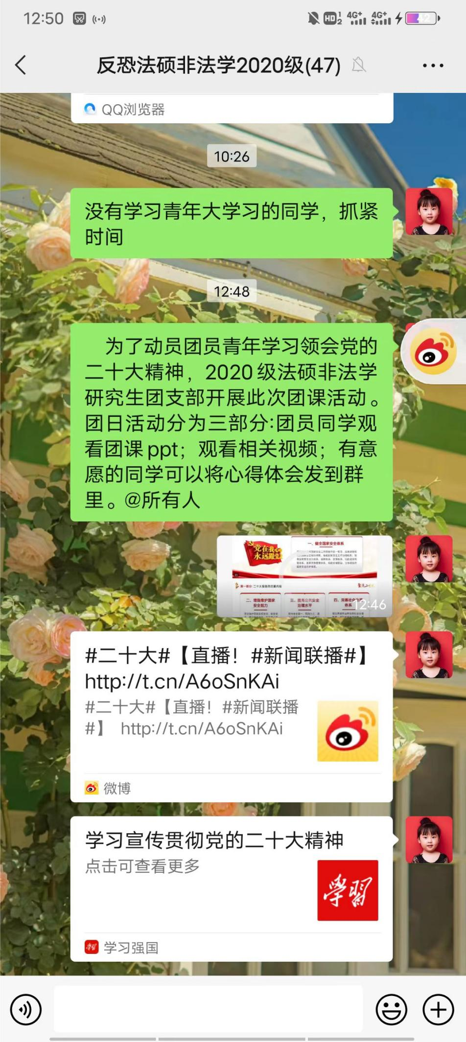 为了深入学习党的二十大报告,深刻体悟党的二十大精神,全面贯彻习近平新时代中国特色社会主义思想,弘扬伟大建党精神,全面提高学生的思想政治素质,让党的二十大精神在团员青年中落地生根。2022年11月11日,捷克论坛 2020级法硕非法学研究生团支部通过线上方式展开“学习党的二十大”主题团日活动。全体2020级法硕非法学研究生参与本次团日活动。