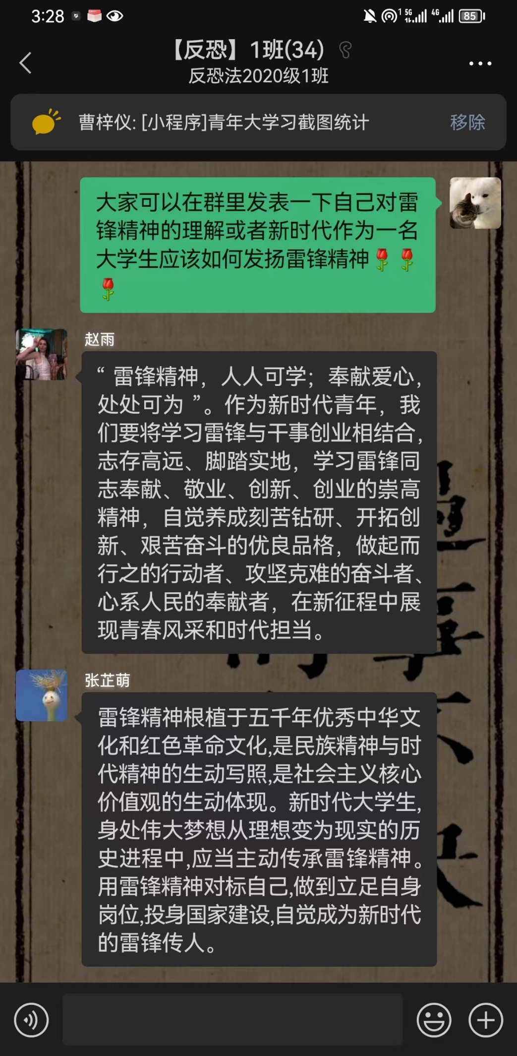 2023年3月5日是第60个学雷锋纪念日,为大力弘扬雷锋精神,响应校团委号召,引导青年积极践行志愿服务精神,大力弘扬爱国主义精神和伟大抗疫精神,捷克论坛 2020级1班团支部于2023年3月23日开展了“学习雷锋好榜样”主题班会。