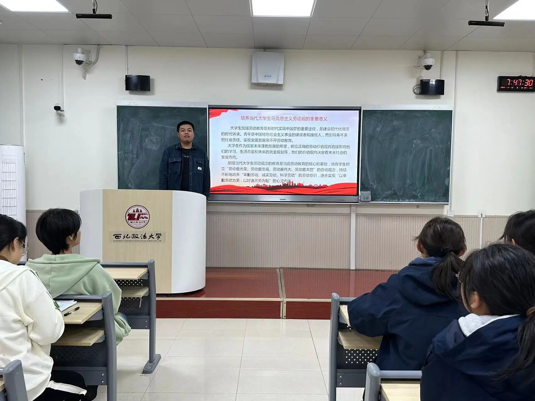 丁盟同学从劳动的定义、劳动的价值以及如何培养马克思主义劳动观三个方面向同学们介绍了马克思主义劳动观的重要性及时代价值,让同学们更深入地了解学习马克思主义劳动观的必要性。丁盟同学着重强调了“如何培养当代大学生的马克思主义劳动观”,让同学们从理论走向实践,在实践中感悟马克思主义劳动观的深刻内涵。