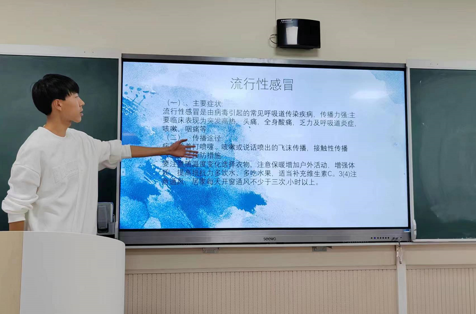 会上,常瑞峰同学以流行性感冒、手足口病、流行性腮腺炎三类常见传染病为例,从主要症状、传播途径、防治措施三方面作简要讲解,使同学们更加了解秋冬季传染病防治的重要性。其中,常瑞峰同学详细介绍了传染病防治措施的内容,力求贴近生活便于实践,真正将传染病防治落实到学生校园生活的方方面面。