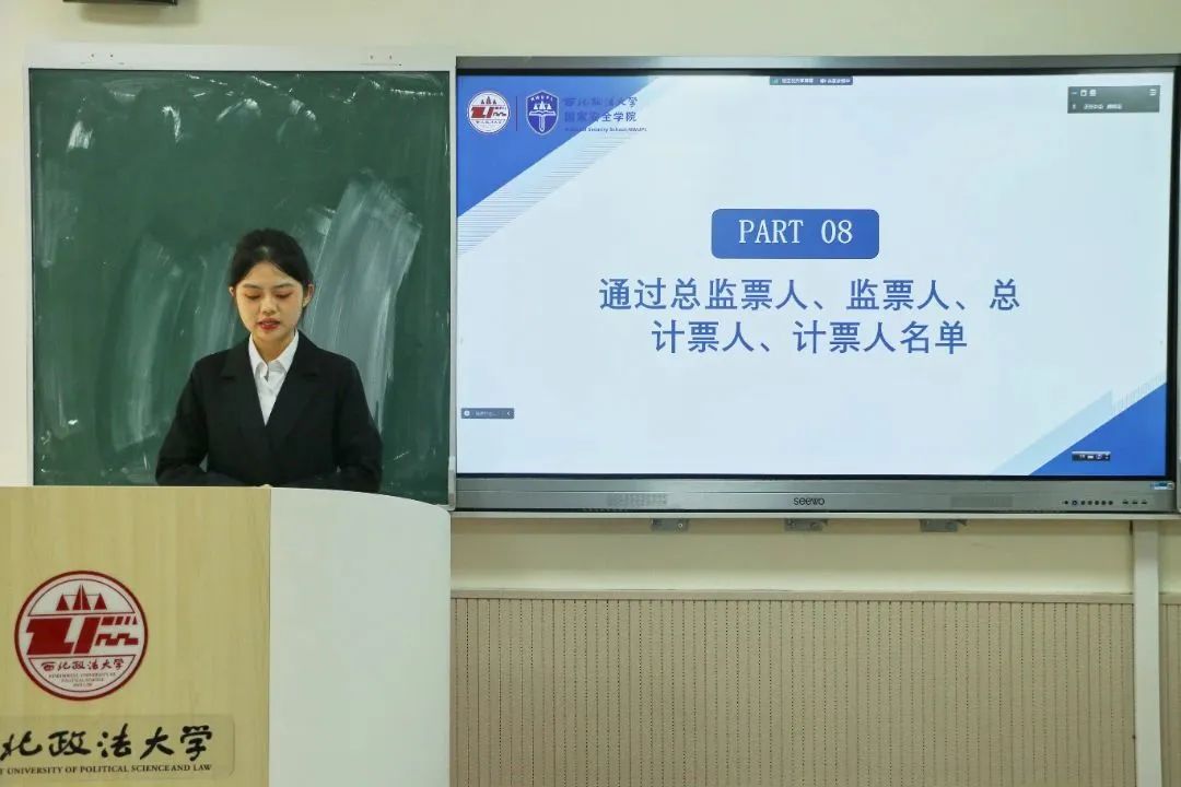 沈楚楚同学宣读总监票人、监票人,总计票人、计票人名单,大会表决通过。