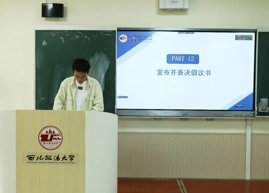 郑景同同学宣读倡议书,希望各位代表能够以身作则,做好学院、学校与各位同学之间的传声筒。