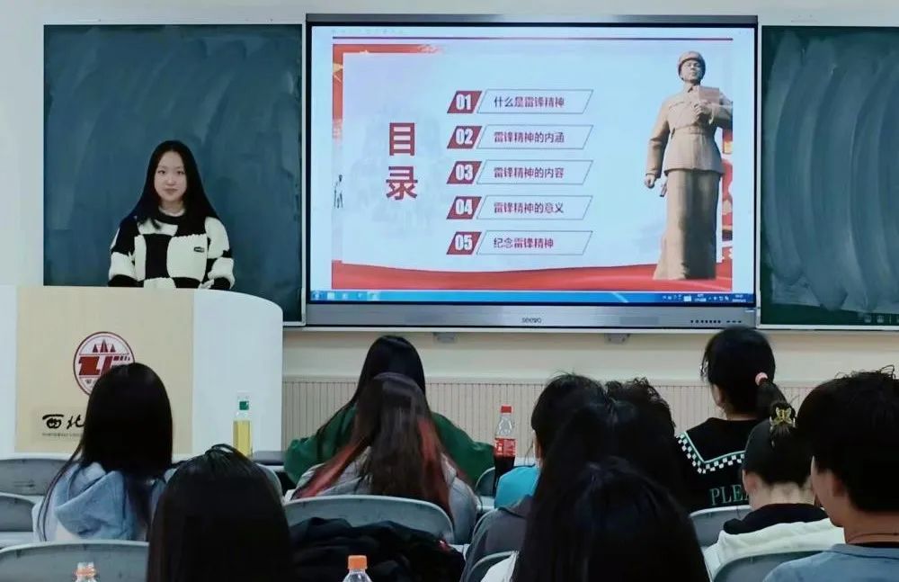 团支书陈橙同学以《雷锋日记》作为切入点,带领团员们重温了雷锋同志的生平事迹;以雷锋精神与时俱进的特质为重点,阐明了学习雷锋精神的必要性,号召团员青年们学习雷锋精神并做到知行合一。