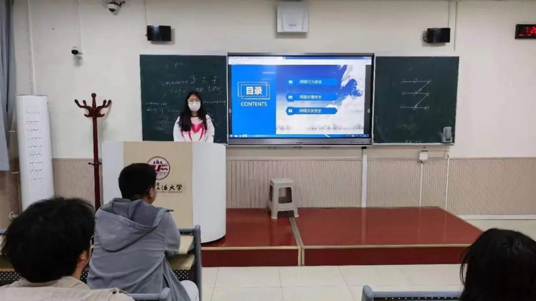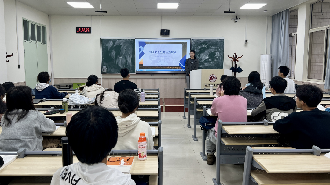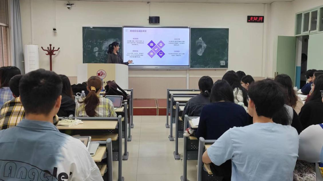 杨欣怡同学从网络安全概述、网络安全防护技术、网络攻击手段及应对策略、网络安全管理与法规政策、网络安全意识培养与教育和网络安全产业发展趋势与前景等方面全面进行了讲解,提升了全体同学的网络安全意识。