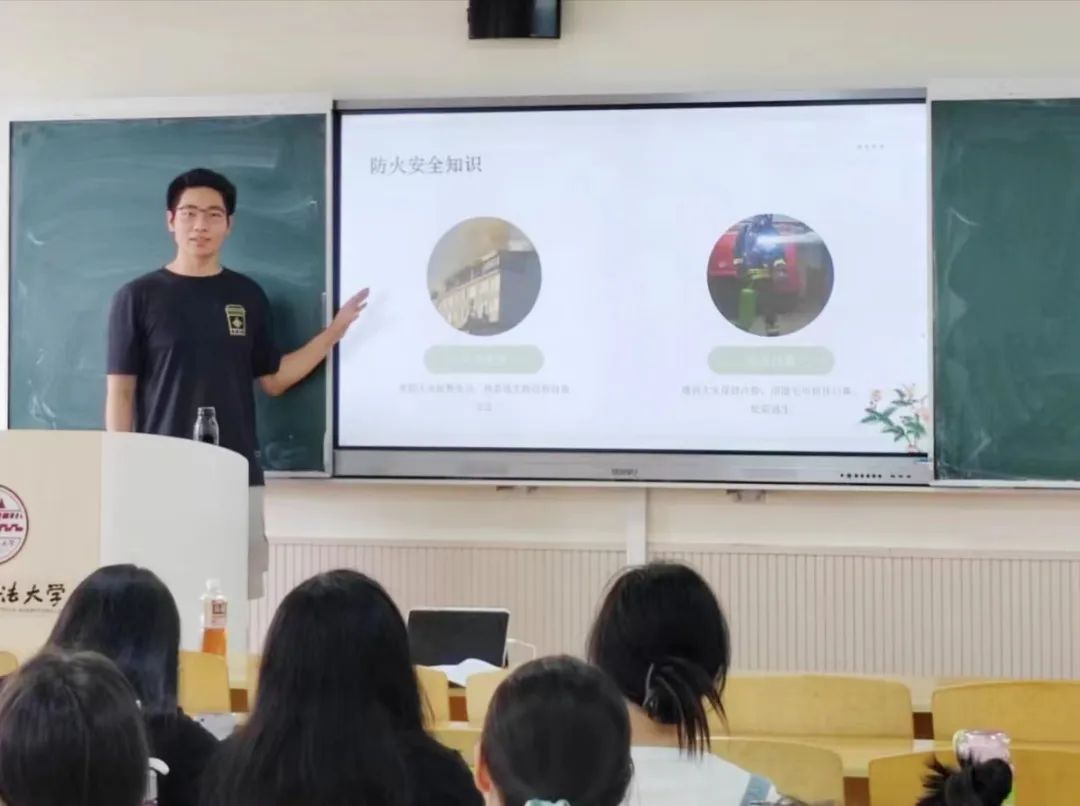 本次班会分为宿舍安全知识普及、宿舍安全行为规范和宿舍安全应急处理三部分,刘具其为同学们介绍了宿舍易发生的安全事故以及相应的处理预防措施,例如常见的火灾起因、不同的灭火方式以及基本的自救知识。