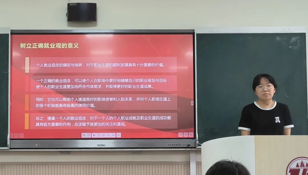 2023级2班团支书杨婧从正视机遇、降低心理预期、端正心态等方面详细讲述正确就业观的内涵。