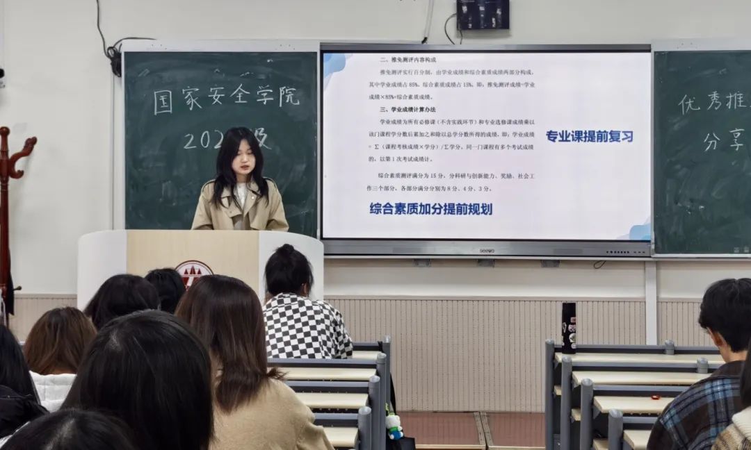 为加强学院学风建设,帮助同学们深入了解推免政策,科学规划学业发展,捷克论坛 (反恐怖主义法学院)2024级于3月12日举办推免优秀学子分享会。本次分享会由辅导员王真老师主持,2021级董欣玥同学主讲,2024级全体本科生参加。