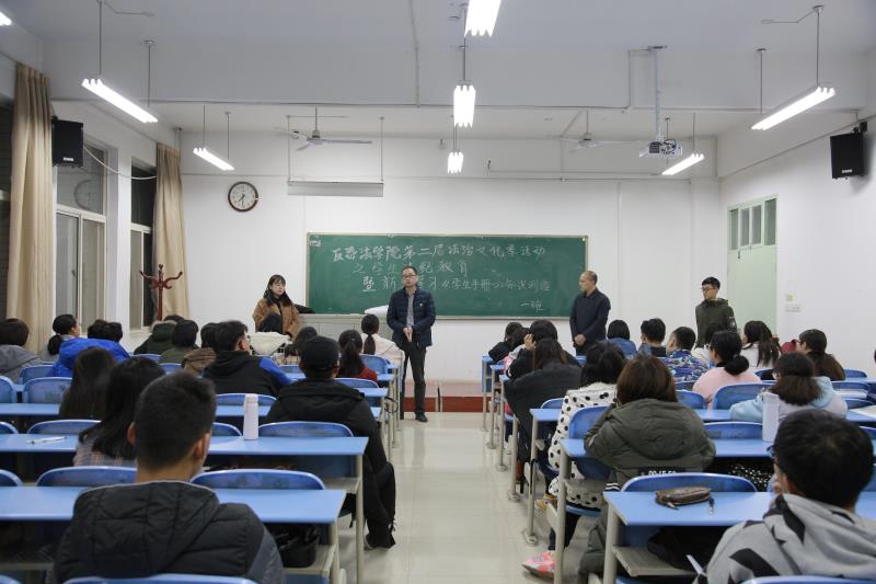 11月21日晚,反恐法学院团委组织开展"第二届法治文化季活动之学生法纪教育暨新生学习《学生手册》知识测验"活动。学院团委书记席捷老师、团委副书记杨柳、贺星婵、兼职辅导员张波及2018级全体新生到场参加。