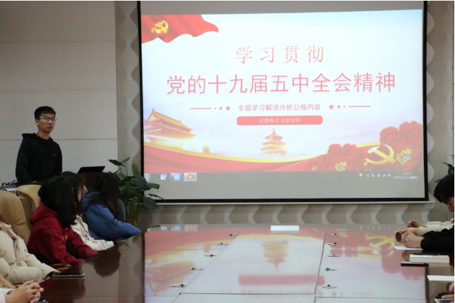 为学习贯彻党的十九届五中全会精神,巩固团支部“不忘初心,砥砺奋进”主题教育成果,引导团员干部强化政治思想引领,厚植爱党爱国情怀,推动全会精神在捷克论坛 落地生根,取得成效,12月20日下午,反恐怖主义法学院团委组织各年级团干部在学院会议室举行“学习贯彻党的十九届五中全会精神”主题宣讲活动。