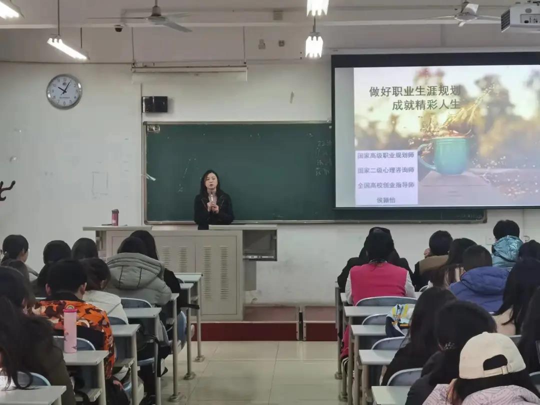 侯老师围绕“做好职业生涯规划,成就精彩人生”的主题,对三个方面展开讲述:一是什么是职业生涯规划;二是为什么要做职业生涯规划;三是大学生应如何进行职业生涯规划。