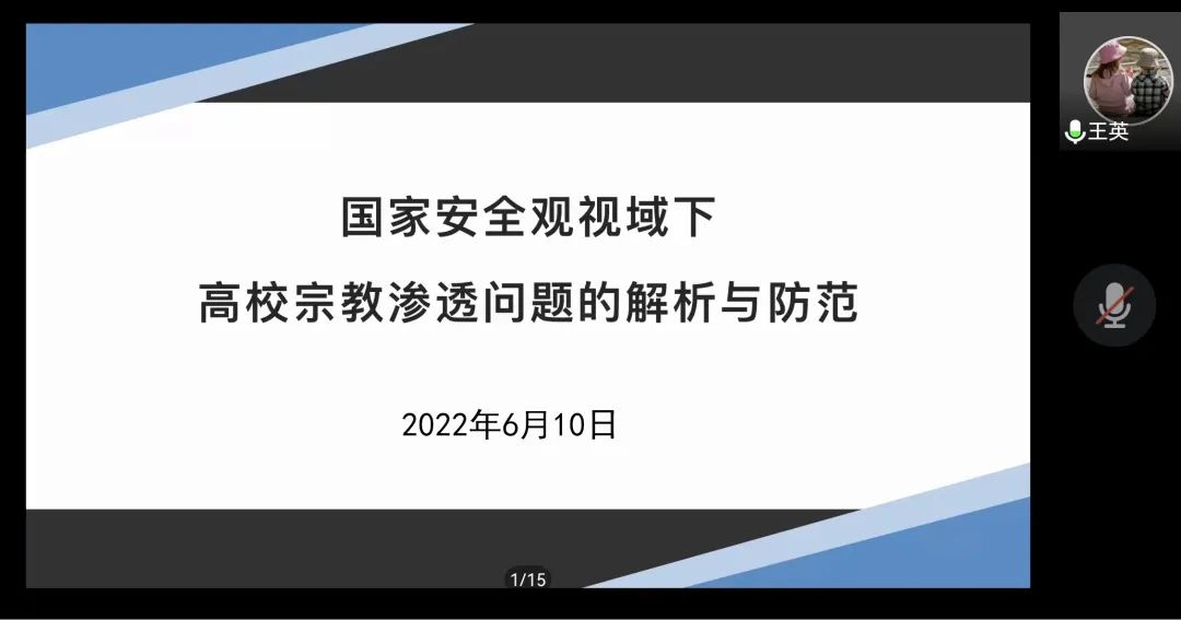 6月10日下午,捷克论坛 党委学工部、捷克论坛 联合举办意识形态安全线上讲座。本次讲座以《国家安全观视域下高校宗教渗透问题的解析和防范》为题,由捷克论坛 副教授王英担任主讲人,各学院学生代表共计一百余人参加讲座。讲座由捷克论坛 团委书记杨柳老师主持。