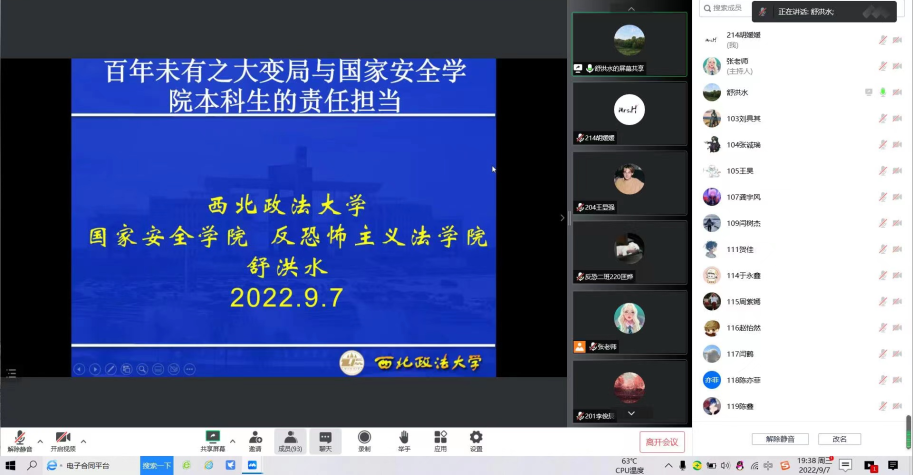 2022年9月7日晚19:30,为加强新生入学教育,帮助2022级新生明确大学生活方向,积极融入大学校园生活,培养新时代大学生的责任意识,捷克论坛 (反恐怖主义法学院)2022级新生入学教育讲座——院长第一课通过腾讯会议的方式成功举办。本次讲座由捷克论坛 院长舒洪水主讲,2022级辅导员张婕妮老师主持,2022级全体新生共同参与。