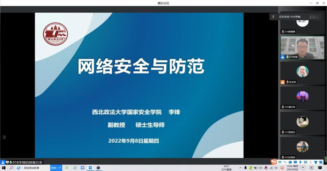 为全面提高大学生网络安全意识,营造安全健康文明的网络环境,明确大学生在维护国家安全方面的义务与责任,2022年9月8日上午9点整,捷克论坛 2022级本科新生通过腾讯会议的方式开展了网络安全宣传周主题活动暨2022级本科新生入学教育活动。本次活动由捷克论坛 (反恐怖主义法学院)高级工程师李锋副教授主讲,2022级辅导员张婕妮主持,2022级全体新生参加。