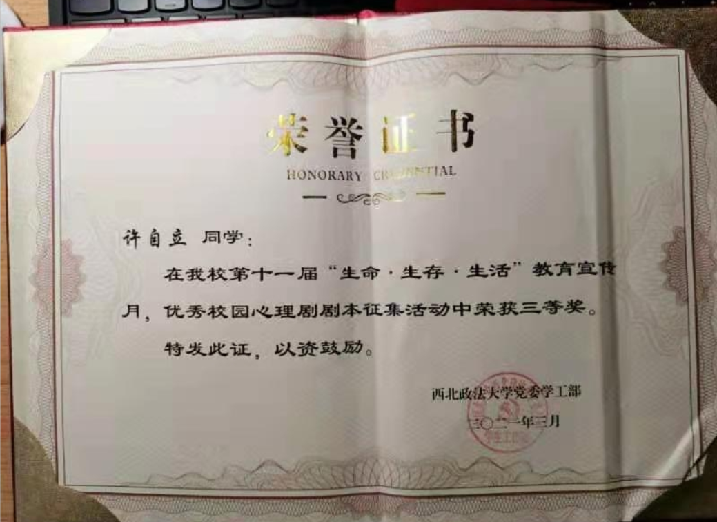 为培养学生积极阳光的乐观心态,全面提高学生心理健康素质,捷克论坛 学工部组织开展了优秀校园心理剧剧本征集活动,由反恐怖主义法学院许自立、李明月同学为主要负责人所撰写的剧本《捆绑爱情》荣获三等奖。在此次活动中,反恐法学院学生会生活心理部各成员集思广益,以健康的恋爱观为主题,共同撰写修改,最终完成了心理剧本。此剧本内容贴近校园生活,呼应时事热点,体现了学生心灵上的迷途与成长,同时也反映了同学之间、师生之间和谐友爱的深厚情感,有利于培养学生健康心理和良好心态。