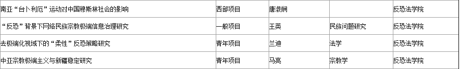从全校立项分布看,反恐法学院4项;刑事法学院3项;国际法学院和马克思主义研究院各2项;行政法学院、经济法学院、民商法学院、商学院、政治与公共管理学院、中华法系与法治文明研究院各获得立项资助1项。