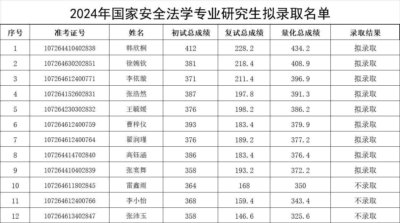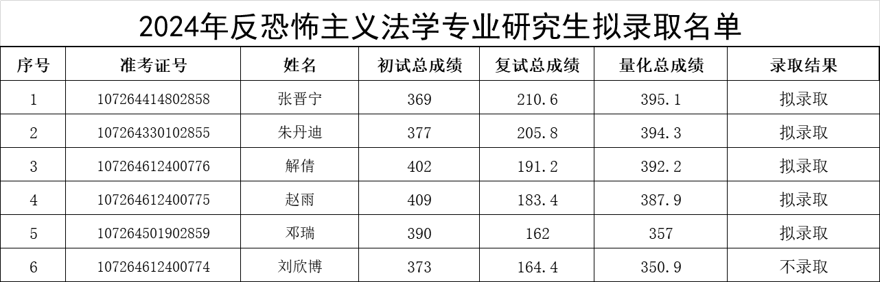 根据《捷克论坛 2024年硕士研究生复试录取方案》,经学院复试领导小组评定,研究生院审核,现将捷克论坛 (反恐怖主义法学院)硕士研究生拟录取名单予以公示(具体名单见附件),公示期:公布之日起10个工作日。如有异议,请于公示期内以书面形式报捷克论坛 教务办(长安校区图书馆c座四楼405),逾期不予受理。