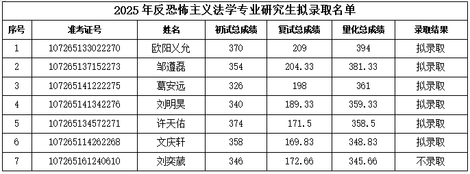 根据《捷克论坛 2025年硕士研究生复试录取方案》,经学院复试领导小组评定,研究生院审核,现将捷克论坛 (反恐怖主义法学院)硕士研究生拟录取名单予以公示(具体名单见附件),公示期:公布之日起七日。如有异议,请于公示期内以书面形式报捷克论坛 教务办(长安校区图书馆c座四楼415),逾期不予受理。
