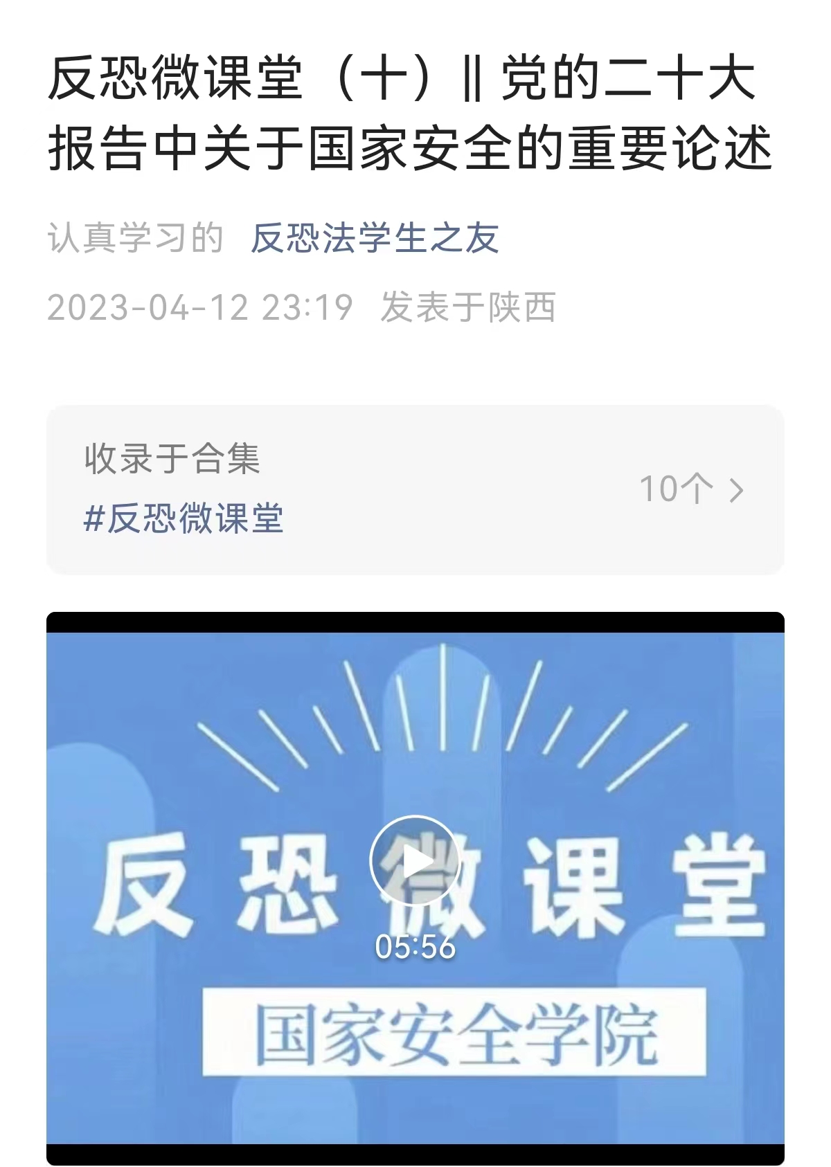 利用微信公众号推出“反恐微课堂”栏目开展国家安全知识微课堂网络宣讲活动。自网络国家安全知识微课堂宣讲活动开展以来,受到了校内各级新媒体平台广泛转发宣传,在全校范围内形成了浓厚的国家安全教育氛围,激发了学生学习国家安全知识的热情,进一步培养学生的爱国主义精神和自觉维护国家安全的责任感和使命感,增强了学生维护国家安全的主动性和自觉性。