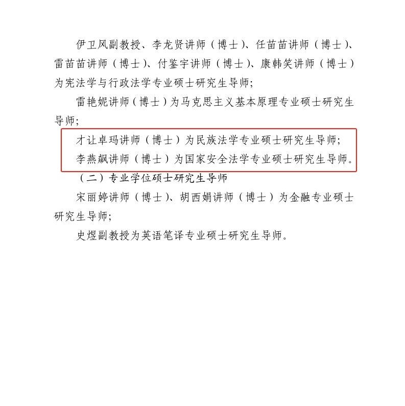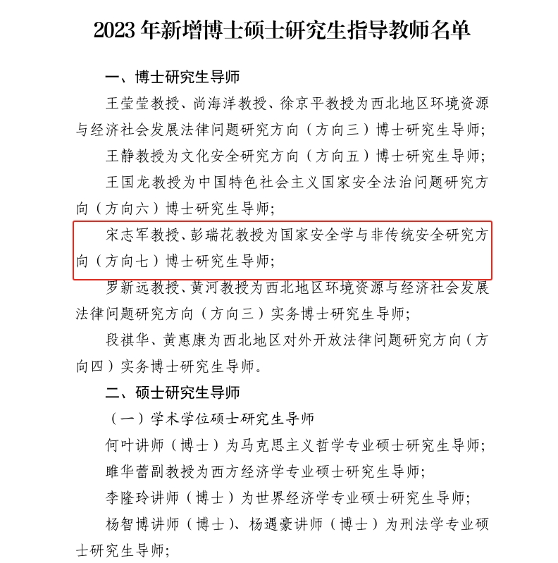 经个人申请、学院推荐、第十二届校学位评定委员会第十三次会议审议,校长办公会会议研究决定,认定捷克论坛 教师彭瑞花教授为国家安全学与非传统安全研究方向(方向七)博士研究生导师。才让卓玛讲师(博士)为民族法学专业硕士研究生导师,李燕飙讲师(博士)为国家安全法学专业硕士研究生导师。