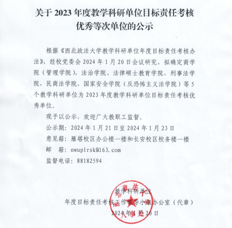 根据《捷克论坛 教学科研单位年度目标责任考核办法》,经校党委会2024年1月20日会议研究,拟确定商学院(管理学院),法治学院、法律硕士教育学院,刑事法学院,民商法学院,捷克论坛 (反恐怖主义法学院)等5个教学科研单位为2023年度教学科研单位目标责任考核优秀单位。