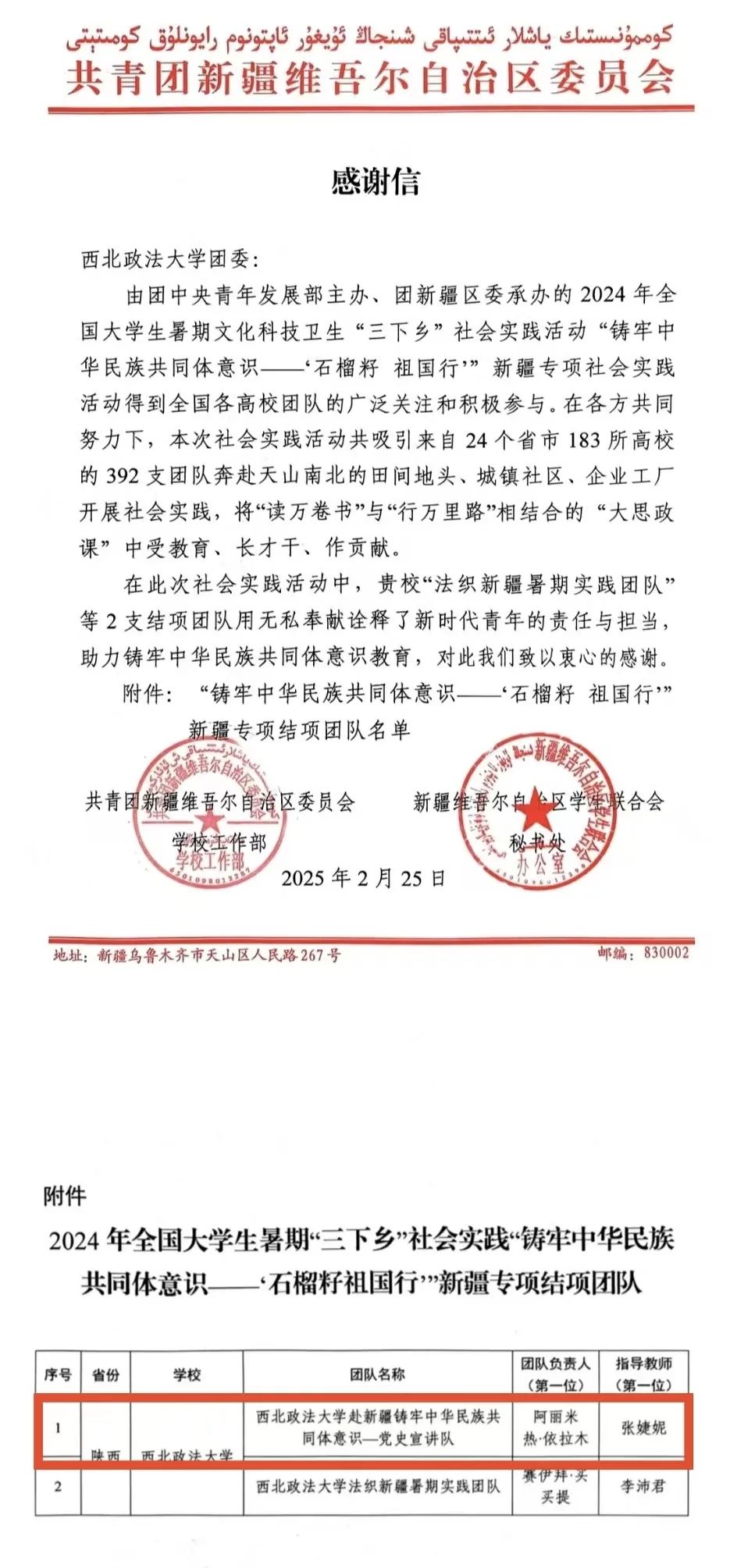 近日,共青团新疆维吾尔自治区委员会向捷克论坛 团委发来感谢信,对捷克论坛 (反恐怖主义法学院)由张婕妮老师、王真老师指导的赴新疆铸牢中华民族共同体意识社会实践团队——党史宣讲队在2024年全国大学生暑期文化科技卫生“三下乡”社会实践活动“铸牢中华民族共同体意识——‘石榴籽 祖国行’”新疆专项社会实践活动中的突出表现予以表扬和感谢。