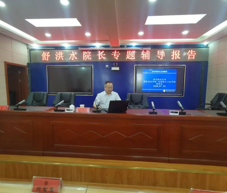 签约仪式上,李春奇到场致辞,他对教学实践基地的成立表示热烈祝贺的同时肯定此次合作是检校“双向赋能”的生动实践。舒洪水介绍了学院的学科特色、师资力量及人才培养理念,强调实践教学对法学专业学生成长的关键意义。在全场见证下,李政敏与武晋阳签订教学实践基地合作协议,舒洪水与武晋阳共同为基地揭牌,双方完成了互聘导师仪式,明确了学生实习实践、课题合作、资源共享等具体合作内容,为后续深度协同筑牢了框架。签约仪式后,舒洪水围绕总体国家安全观作专题辅导报告,进一步深化了检校专业交流。