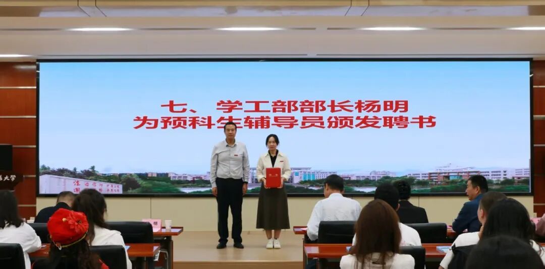 典礼上,全体参会领导为预科生代表佩戴校徽,杨明为预科生辅导员王真颁发聘书,何玉军为预科生代表赠送入学纪念品,马玲为预科生代表赠书。