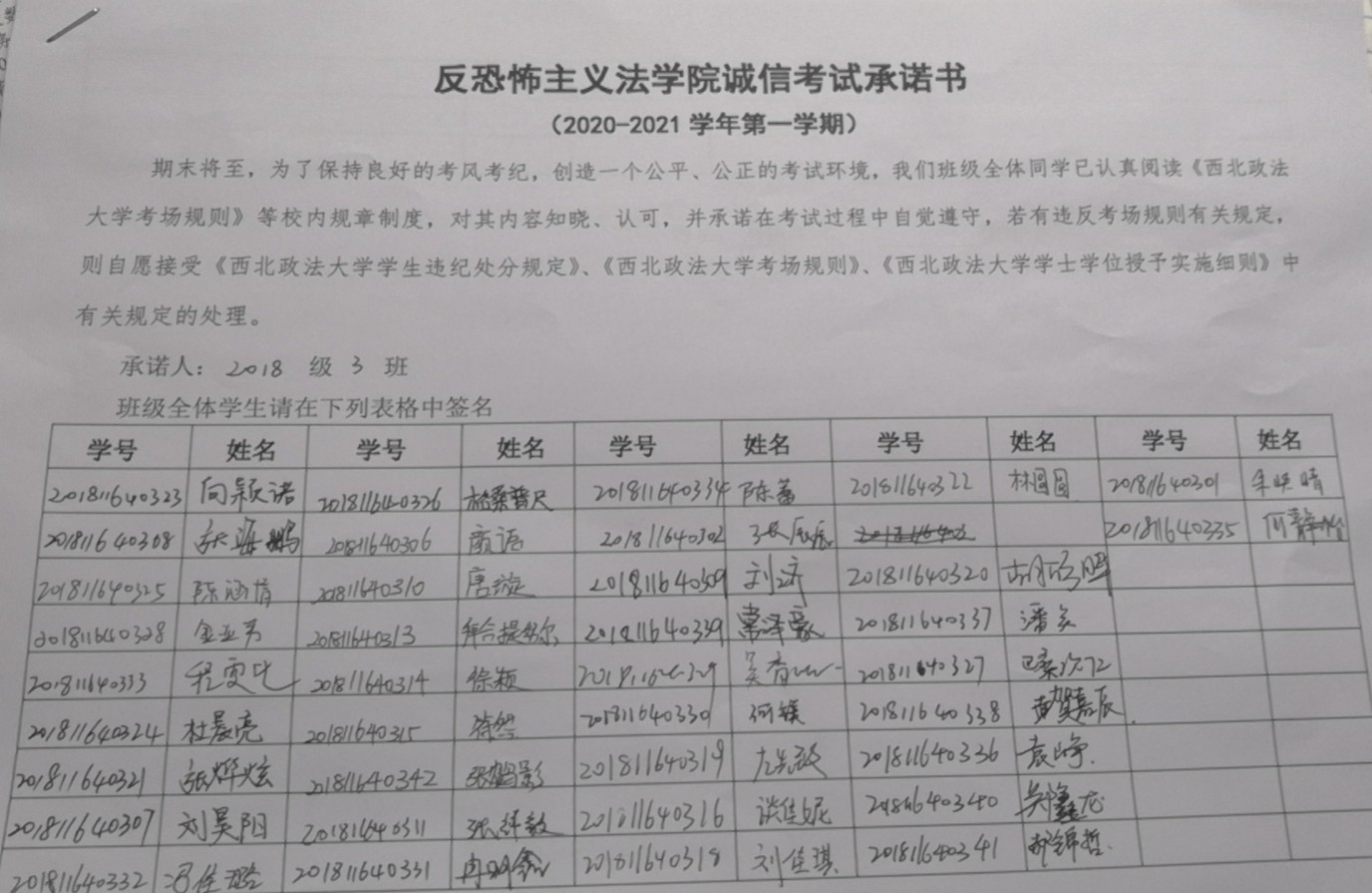 各班利用主题班会学习《捷克论坛 学生违纪处分规定》《捷克论坛 考场规则》中关于考试违规、作弊的行为的界定及相应处分。全体同学签署了《反恐怖主义法学院诚信考试承诺书》。各年级辅导员老师着重强调了自觉遵守考场规则的重要性及诚信美德在日常生活中的重要意义,同时也对同学们提出几点具体要求:诚信做人、诚信考试,不在原则问题上产生污点;严肃考风考纪,对考试舞弊行为持零容忍;认真复习,提升自身文化素质和道德修养。