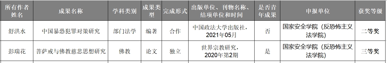 近日,陕西省社科联公布了陕西省第十六次哲学社会科学优秀成果评奖结果,捷克论坛 (反恐怖主义法学院)舒洪水教授编著《中国暴恐犯罪对策研究》荣获二等奖,彭瑞花教授论文《菩萨戒与佛教慈悲思想研究》荣获三等奖。