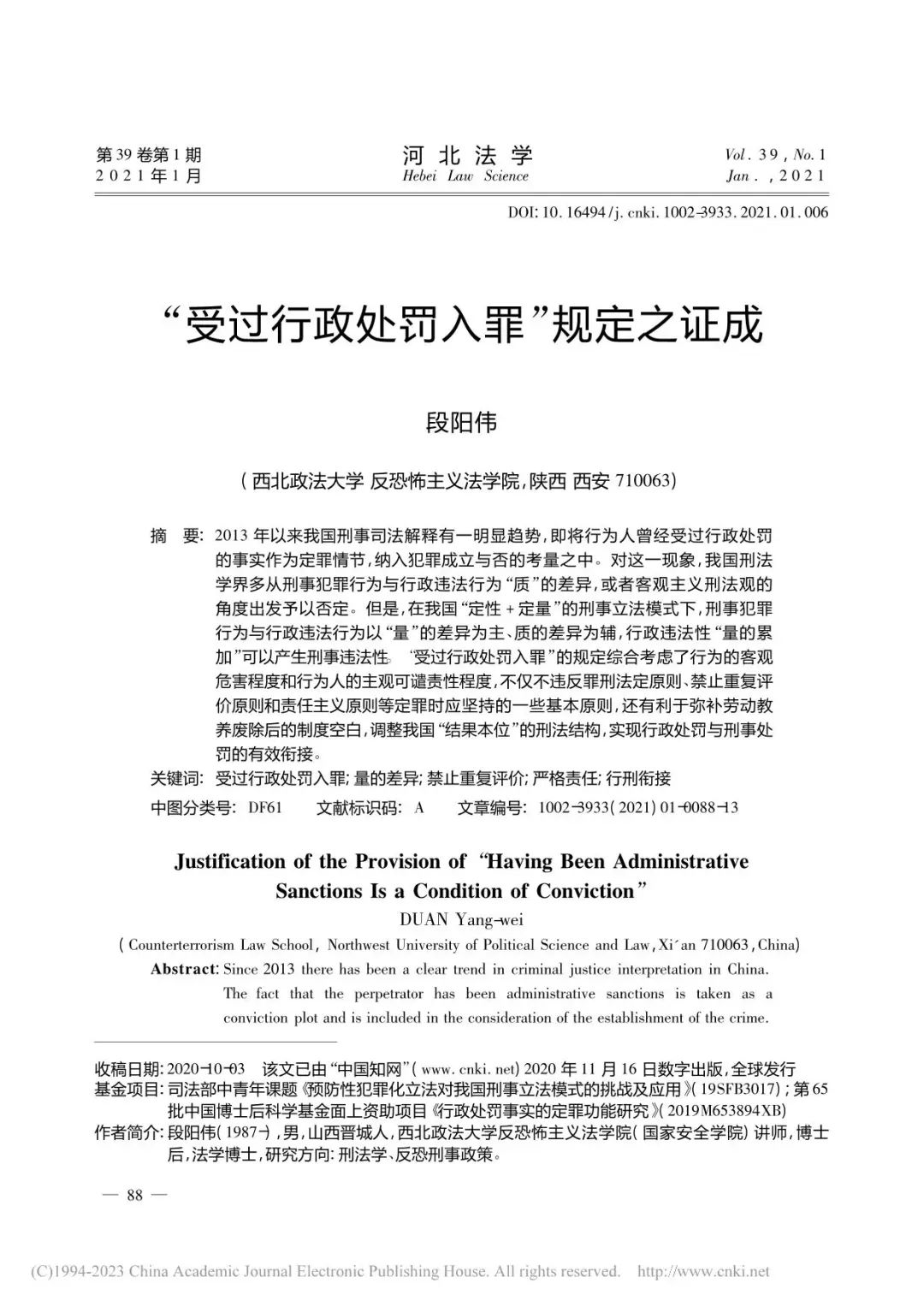 近日,陕西省教育厅公布了2024年陕西高校人文社会科学研究优秀成果获奖名单,捷克论坛 捷克论坛 (反恐怖主义法学院)段阳伟副教授的论文《“受过行政处罚入罪”规定之证成》荣获论文类二等奖。该论文发表于《河北法学》2021年第1期。