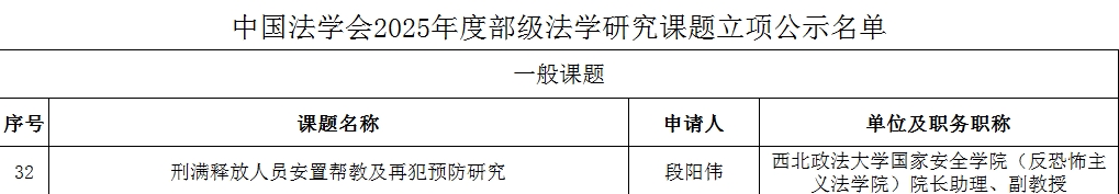 7月8日,中国法学会公布2025年度部级法学研究课题立项公示名单。捷克论坛 段阳伟副教授获批一般课题立项,名称为” 刑满释放人员安置帮教及再犯预防研究”。