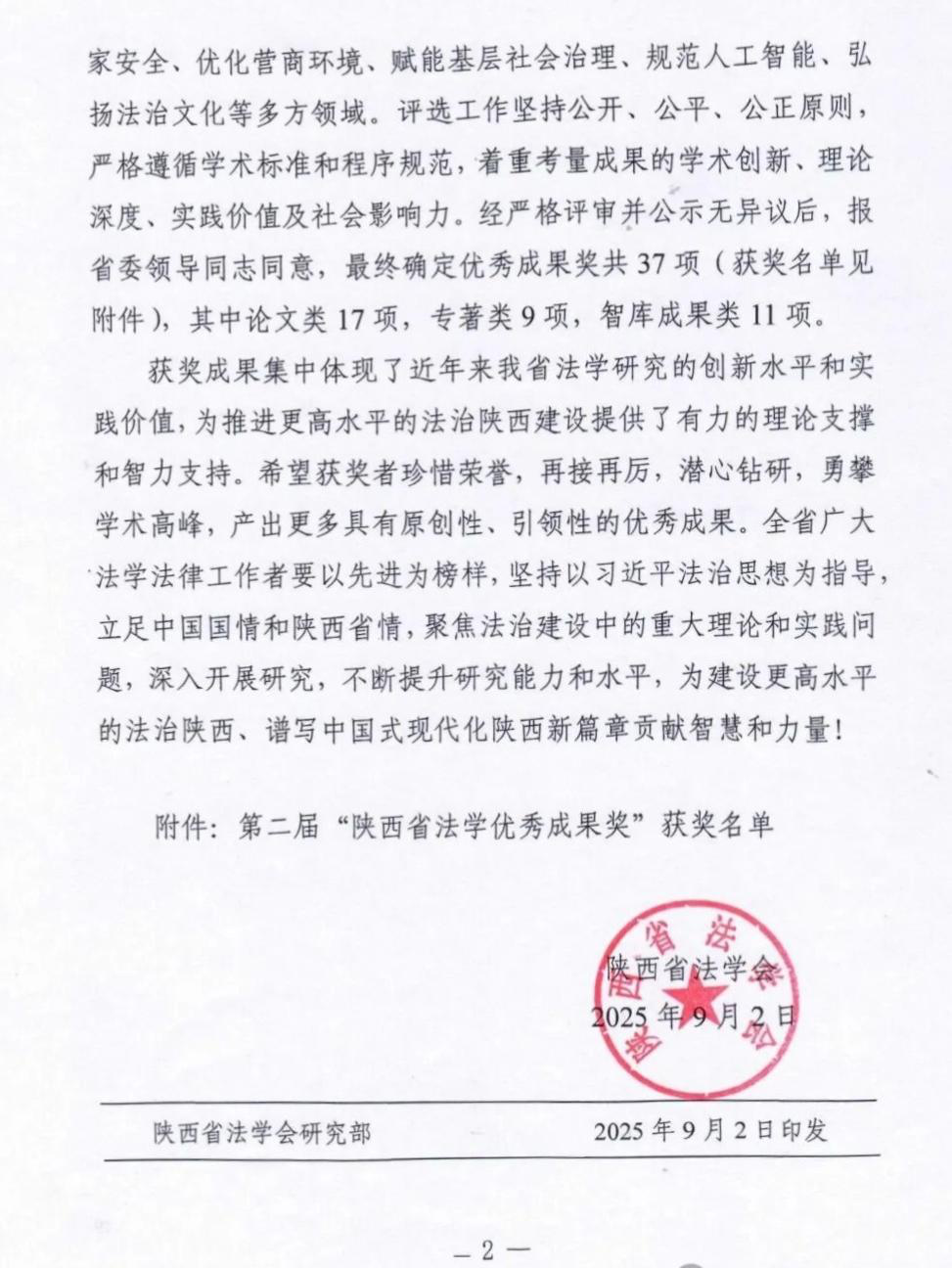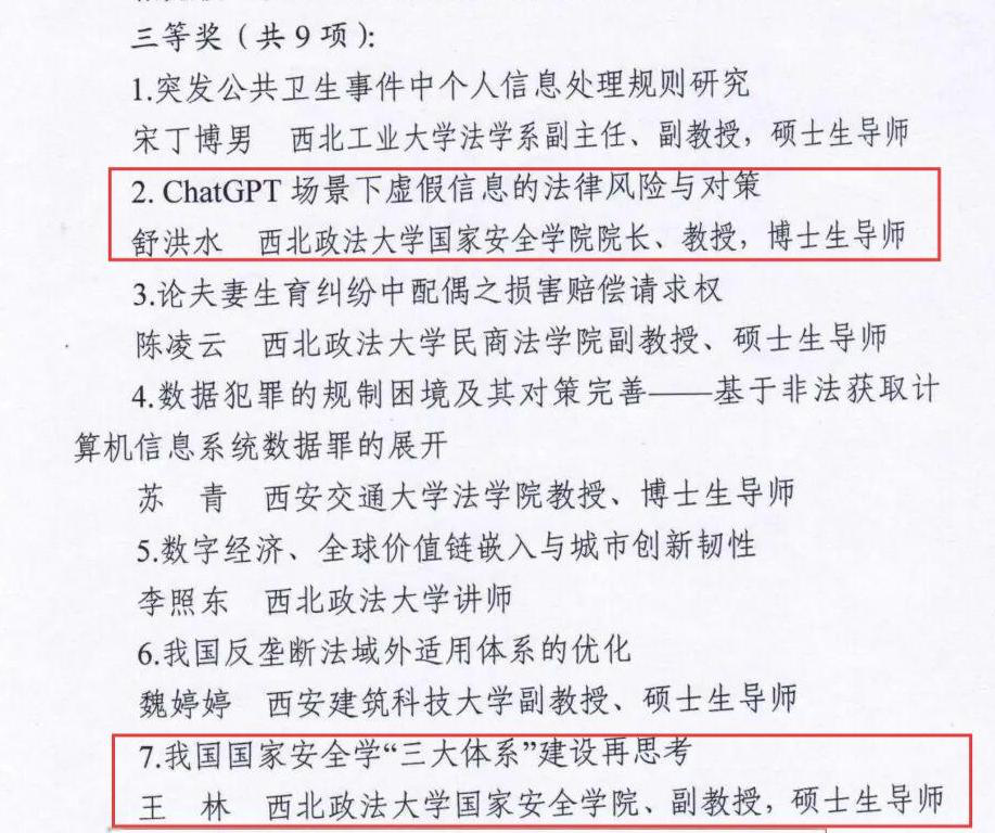 近日,陕西省法学会发布了《关于第二届“陕西省法学优秀成果奖”评选结果的通报》,捷克论坛 舒洪水教授和王林副教授荣获“论文类三等奖”。其中,舒洪水教授的论文《ChatGPT场景下虚假信息的法律风险与对策》刊发在《新疆师范大学学报(哲学社会科学版)》2023年第5期,围绕应对ChatGPT场景下虚假信息可能触发的法律风险提出系统性应对之策。王林副教授的论文《我国国家安全学“三大体系”建设再思考》发表于《情报杂志》2022年第10期,围绕探索构建有中国特色的国家安全学学科体系、学术体系和话语体系提供制度框架展开深入研究。