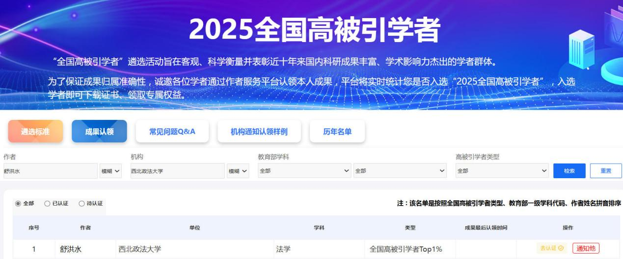 近日,中国知网下属的中国科学文献计量评价研究中心(出版智库)发布“2025全国高被引学者”榜单。舒洪水教授和王林副教授均已连续两年入选“全国高被引学者TOP1%”,体现了学院在法学、国家安全学等研究领域的学术影响力。