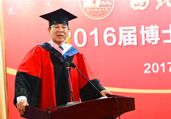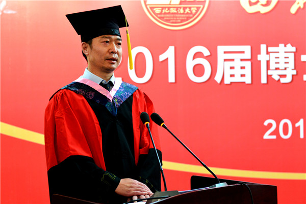 汪世荣代表导师组发言,他希望博士生牢记校训,将毕业作为新的起点,再接再励,并祝愿他们在今后的工作中取得更好的成绩。